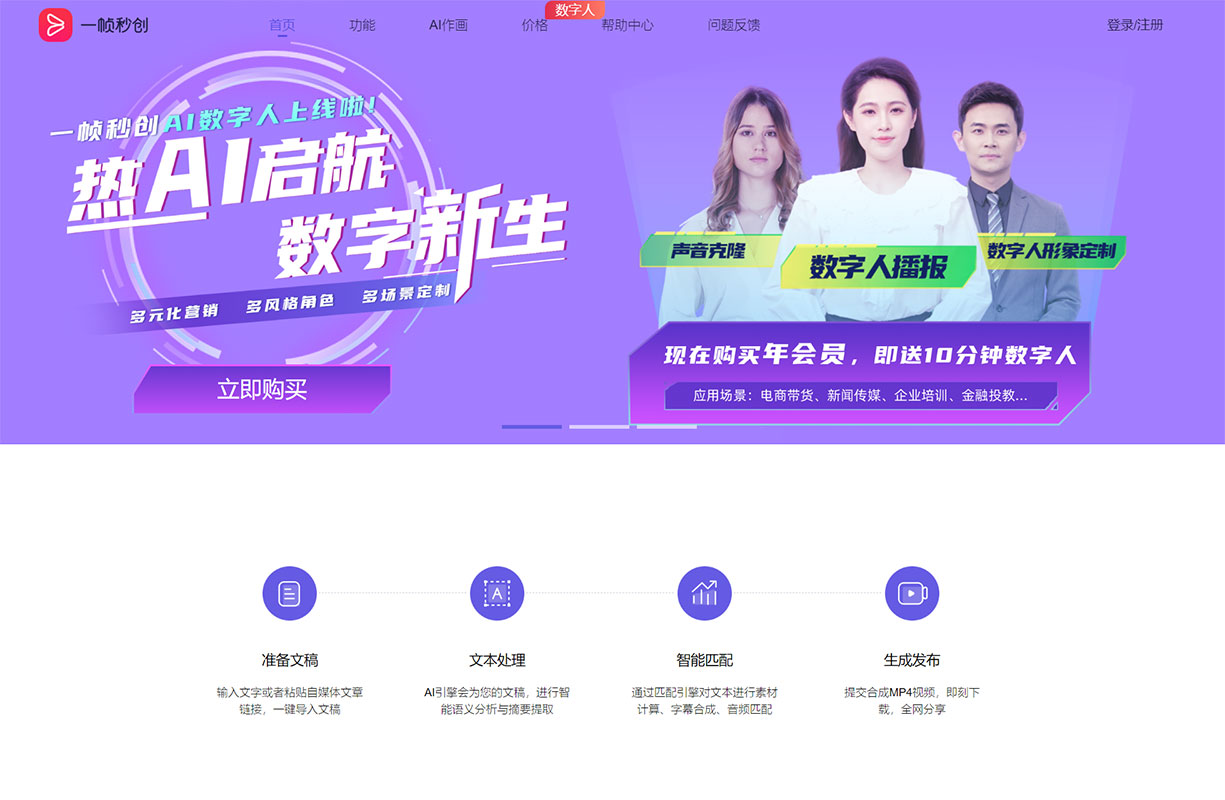 一帧秒创是基于秒创AIGC引擎的智能AI内容生成平台,为创作者和机构提供AI生成服务,包括文字续写、文字转语音、文生图、图文转视频等创作服务,一帧秒创通过对文案、素材、AI语音、字幕等进行智能分析,快速成片,零门槛创作视频。